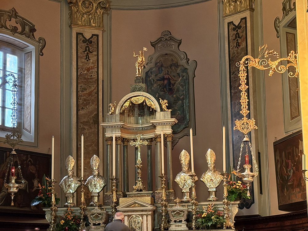 Un elemento architettonico di particolare rilievo è la cupola centrale, con un diametro di circa 11 metri, che poggia su piloni laterali dotati di nicchie. All’interno di queste nicchie trovano posto diverse statue, tra cui spiccano quelle di Sant’Ambrogio e Santa Monica.