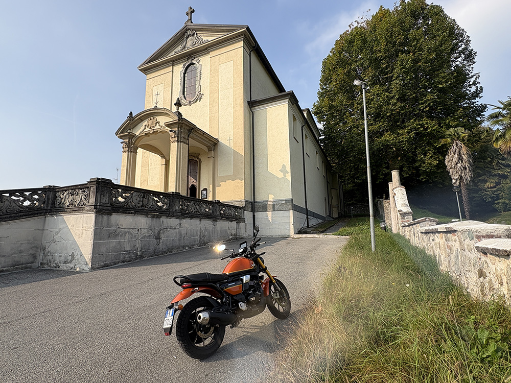 Uno degli aspetti più piacevoli di questo viaggio in moto è stata proprio la bellezza del percorso. La Brianza offre colline dolci, strade panoramiche e un verde rilassante che invita a rallentare e godersi ogni curva. Le strade che collegano i piccoli paesi sono perfette per una guida tranquilla, lontano dal traffico caotico della città. La TVS Ronin si è dimostrata la compagna ideale: agile, confortevole e perfetta per questo tipo di esplorazione territoriale.